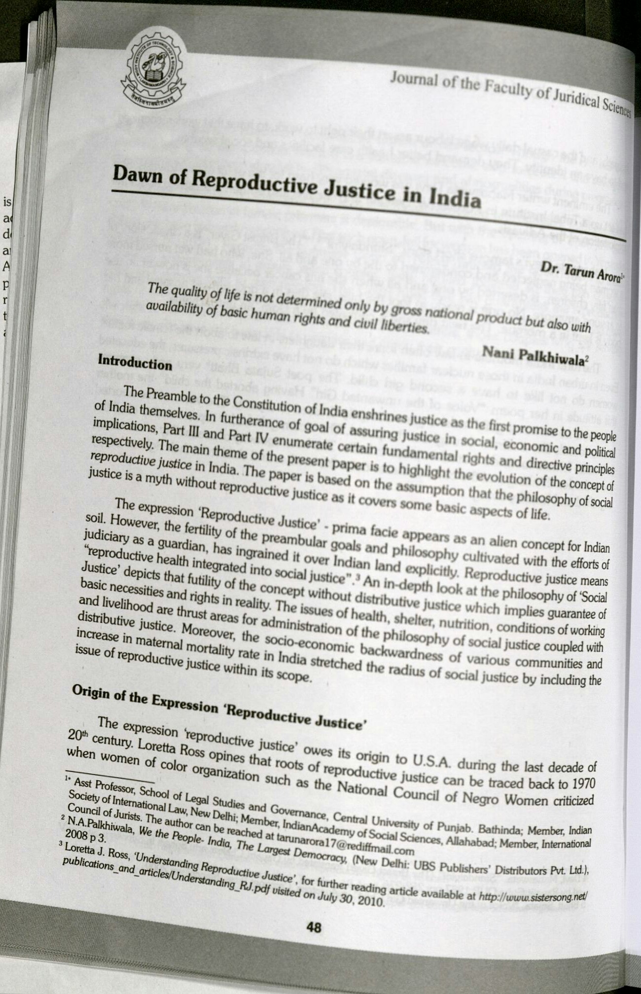 Arora, Tarun And Palkiwala, Nani (2011) Dawn of reproductive justice in India, Journal of the Faculty of Juridical Science, Vol. 3