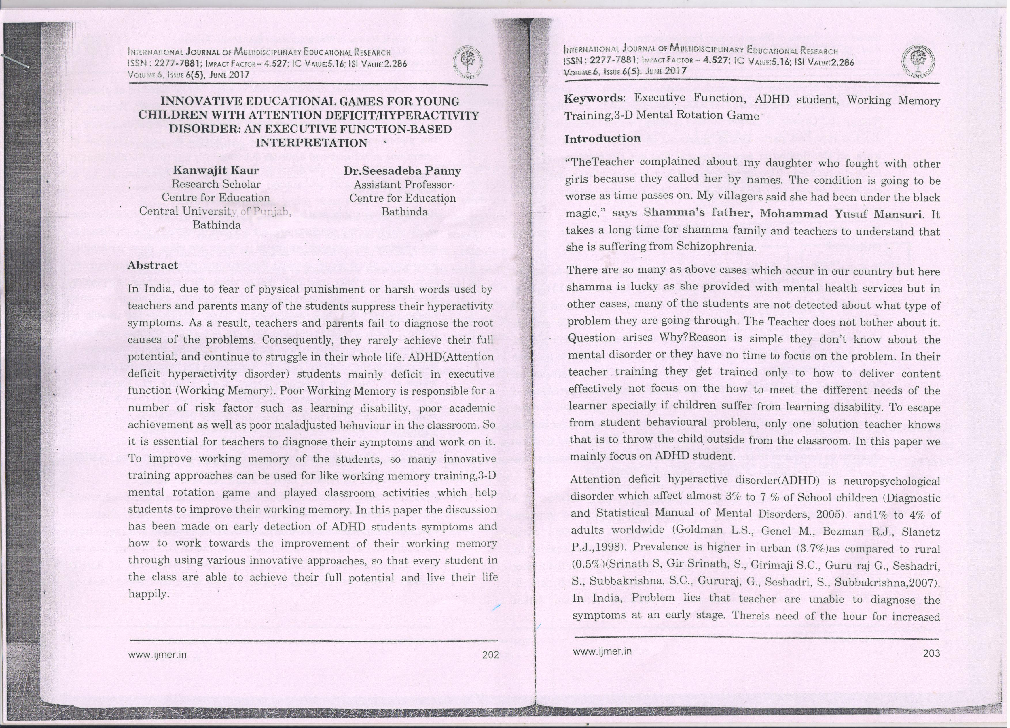Kaur, K and Pany, S., International Journal of Multidisciplinary educational Research(2017) Innovation educational games for young children with attention deficit/ hyperactivity disorder : An executive function-based interpretation. 6(5)