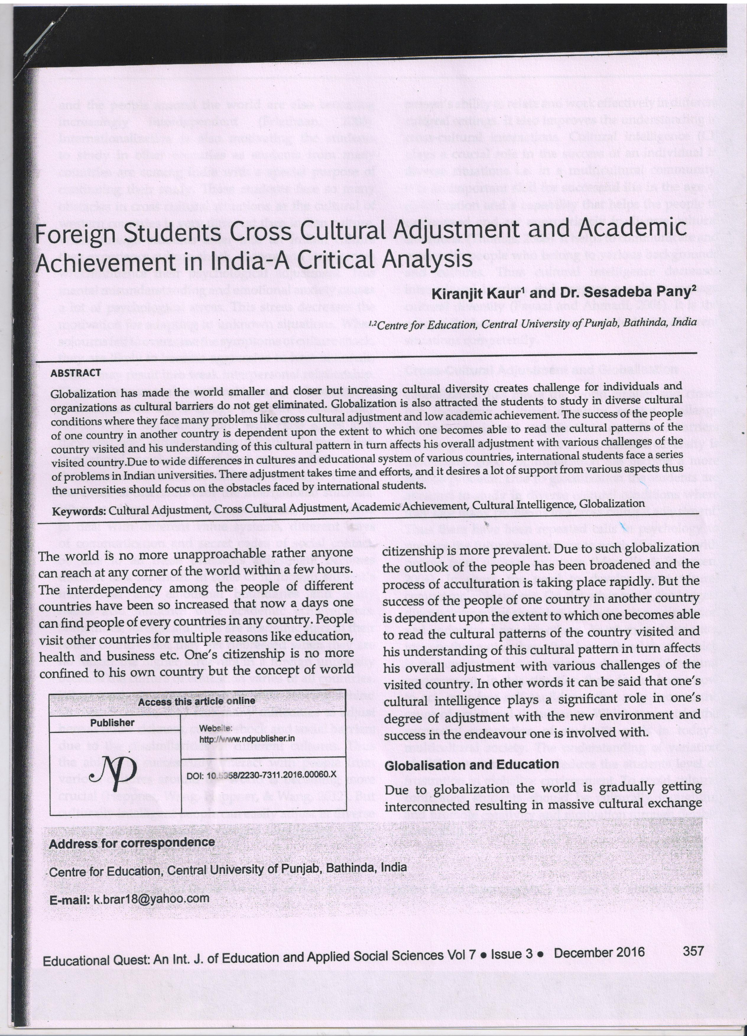 Kaur, K and Pany, S., Educational Quest: An International Journal of Educational And Applied Social Science (2016)Foreign students cross culture adjustment and academic achievement in India- A critical analysis.7(3)