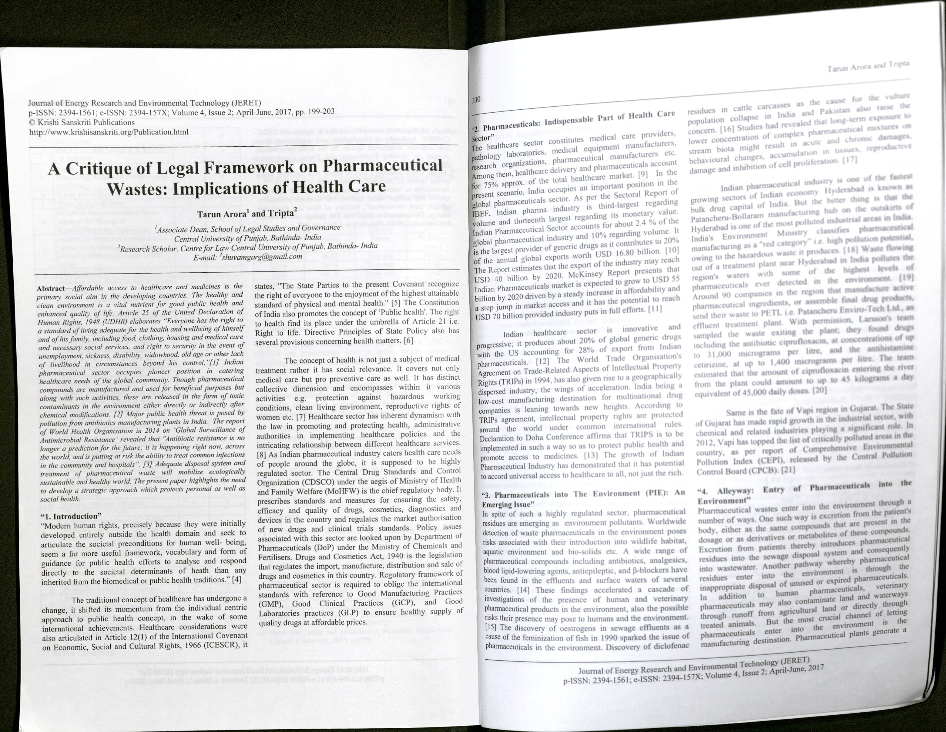 Arora, Tarun And Tripta (2017) A Critique of Legal Framework on Pharmaceutical Waste : Implications of Health Care. Journal of Energy Research and Environmental Technology(JERET), 4(2), 199-203.